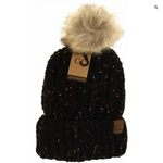 This very popular fuzzy lined fur pom beanie now comes in a flecked color mix! This popular knit of this hat along with a popular fur pom and warm lining will make this a great addition to your beanie collection!