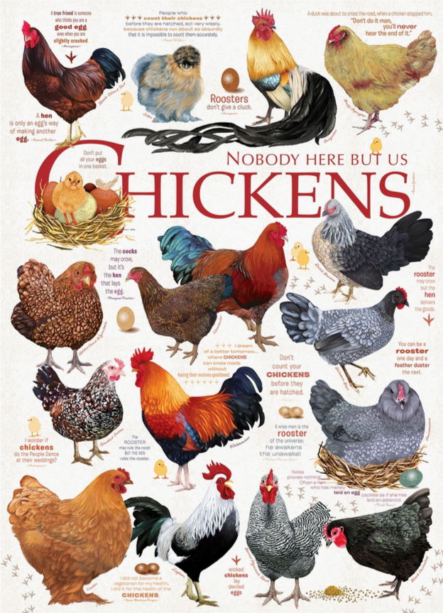 Features a colorful collage of quirky chicken sayings with bright barnyard artwork and playful feather details.