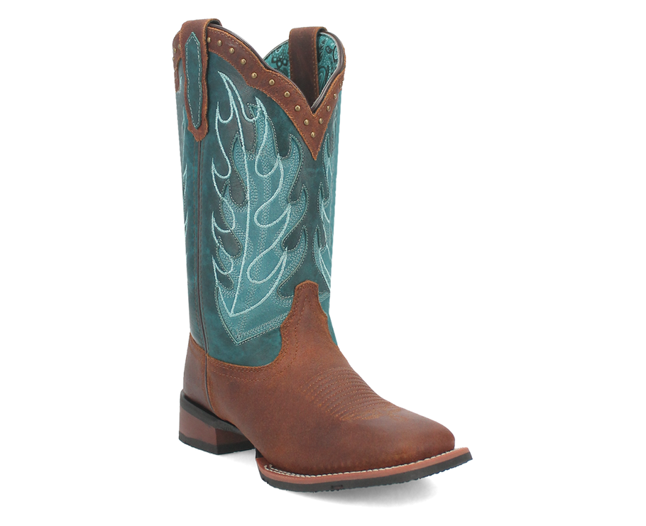 The Laredo Women’s Faye Leather Cowboy Boot in Turq/Rust is a bold Western boot featuring a turquoise shaft with rust leather foot, broad square toe, and stockman heel.