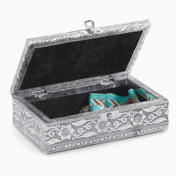 Handcrafted tin box with intricate, scrolling floral border features a galloping horse on its hinged lid. 8" x 5" x 2 1/4".