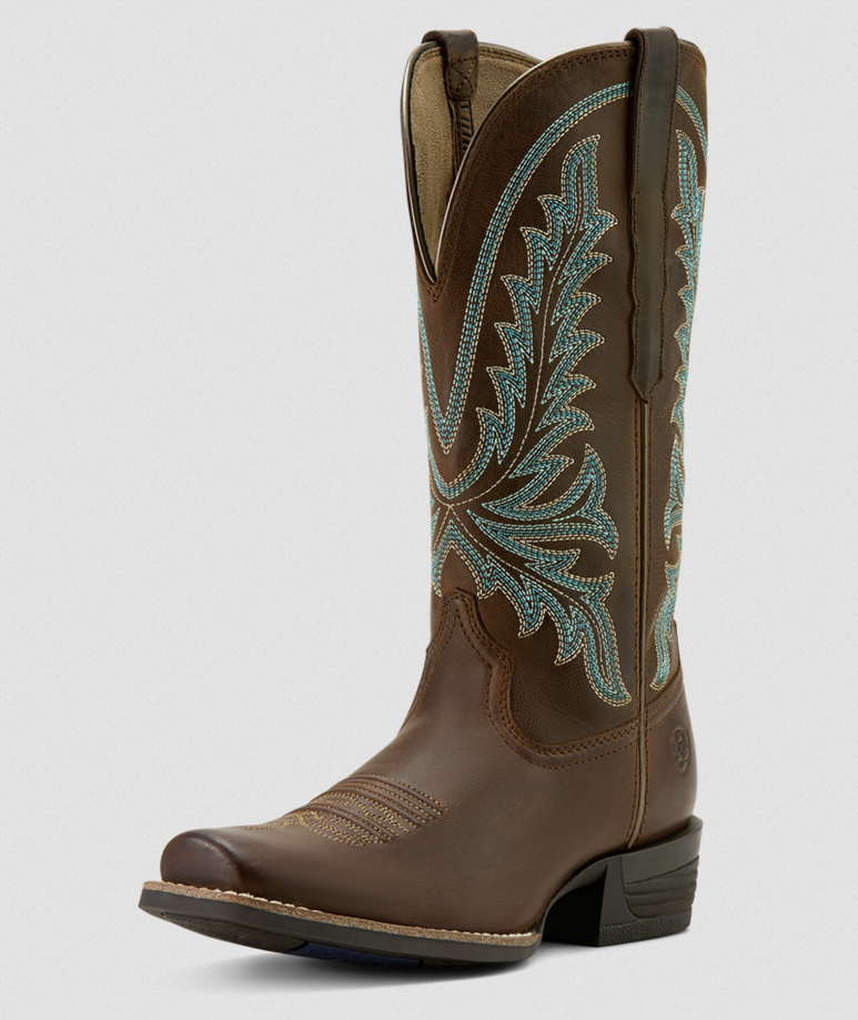 The Rock Creek boot is designed for riders and competitors who need both performance and style. The Shock Shield® heel technology makes it ideal for long days in the saddle or on your feet, while the scalloped shaft and turquoise-accented stitching give it a bold, eye-catching look. It’s a merchandising powerhouse because it appeals to both serious equestrians (comfort, durability) and fashion-conscious Western wear buyers (style, stitch detail).