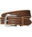 This Ariat men’s belt is genuine leather and is tan with a contrast buck lacing down both sides of the belt. There is a floral tooled strip down the body of the strap. Removable buckle.