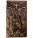 This Nocona rodeo wallet is genuine leather. It features a brown calf hair body with an embossed longhorn overlay. Multiple card and cash slots, checkbook slot and ID window on the inside.