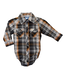 This infant western shirt romper/onesie features a classic brown, tan and black plaid design. Snap closures make for easy changes while keeping your little cowboy stylish and comfortable.
