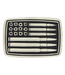 A deeply antiqued silver tone rectangular Attitude buckle with an overall flag design but instead of stars and stripes there are bullet holes and bullets.