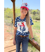 Red, White and Cowboy. Our Americana Bronc Tee features a new, patriotic look to our Bowie Bronc. This V-neck tee is soft and lightweight making it the best choice for your Memorial Day rodeo or 4th of July parade. 95% Polyester, 5% Spandex.